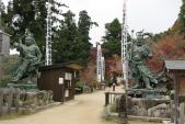| 千早城 2012年11月27日 | 11/27朝から登城開始。 河内長野駅からバス30分で金剛登山口に到着し、まつまさでスタンプと地図を戴こうと探すが見つからず、「山の豆腐」というお店で尋ねると、まつまさは本日休業との事。お店はシャッターが下り、3日間社員研修の為お休みの張り紙を発見。 スタンプゲットできずと一瞬焦りましたが、気を取り直し100名城のスタンプありますかと尋ねると預かっているとの事で、押印し事なきを得ました。 地図もいただき道順も教えてもらい裏道から登城し、帰りは四の丸跡から表参道の階段を降りてきました。 社務所のある三の丸跡、千早神社(二の丸跡)、見晴らしの良い四の丸跡を見物し、所要はちょうど1時間でした。裏道の登り20分程がすこしきつく感じましたが、表参道560段を登るよりは楽と思います。 千早城は楠木正成が13世紀に築城し、寡兵ながら大軍の鎌倉幕府軍と奮戦した城跡で、歴史に残るが故に100名城に選ばれたのだと思います。しかし遺構は曲輪のみと少なく、印象の薄い城巡りになりました。 皇居外苑の楠公像を思い出しつつ、天気の良い秋日和の中1時間のハイキングを楽しみました。これで60城スタンプ完了。 |