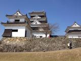 | 宇和島城 2014年3月22日 | 53城目愛媛旅行第2日。10時前に松山市内を愛車で出発。松山自動車道経由で11時半ごろ宇和島城下の市営駐車場に到着しました。途中仮設の急な階段を登って天守閣へ。地元のボランティアの方に記念写真を撮ってもらい、ガイドもお願いしました。天守受付でスタンプを押し、ガイドの方のご丁寧な説明と窓から見る見事な景色に感動いたしました。宇和島城天守閣は戦時に備える城ではなく、城下町の象徴としての存在との説明がありましたが、なるほど石落としや鉄砲挟間がなく、天守閣が独立して建っていることから、他城の天守閣とは異なった趣があるのだなと思いました。郷土料理の鯛めしを食べ、天赦園とガイドさんお薦めの伊達博物館を見学してから大洲城へ向かいました。 |
