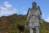 | 大野城 2014年9月13日 | 90城目 まずは、「″太″宰府天満宮」に参詣し御朱印をいただきます。その後「″大″宰府政庁跡」の「展示館(オススメ!)」を見学し、「四王寺山史跡マップ」を入手してから、徒歩で岩屋城へ。なんといっても、あの高橋紹運公の最期の地。お墓参りをしてから「嗚呼壮烈岩屋城址」の碑を見たときは、感慨無量でした。 その後、「増長天礎石群」「太宰府口城門跡」から、大野城(四王寺山)の周回を開始しますが…きついです。ともかく広大です!!!私の今までの中(90城目)ではブッチギリNo.1のきつさでした。(岩屋城までは、タクシーで行き体力を温存することをお勧めします。) 兎も角、政庁跡に自販機が見あたらず、水の追加補給ができなかったのが響きました。500mlのペットボトルは、猛暑の前に底をつき…渇きに苦しみながらの山行で「百間石垣」からは「県民の森センター」にエスケープ。自販機を見つけた時には、涙が出そうになりました。 1350年も前にこのような広大な防衛拠点が築かれたことは、本当に驚きです。 最後は、なんとか「水城」見学もして一日を締めました。 |