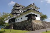 | 宇和島城 2014年8月31日 | 87城目 まずは、三の丸「桑折氏 武家長屋門」から登城。「井戸丸」を経て「二の丸」「本丸・天守」へ。やはり、現存天守の内側は、歴史の重さがありますね。 帰りは「藤兵衛丸」「長門丸」を経て「上り立ち門」まで下った後、 再度「長門丸」の「城山公園事務所」まで戻り、「長櫓」側の巻き道を使いスタート地点の「武家長屋門」に下りました。こちらのルートでは、「長門丸」の「西角櫓」「北角櫓」間の石垣を見学することができます。 残念ながら、本丸下の「帯曲輪」「太鼓櫓跡」や、藤兵衛丸近くの雷門からの分岐がある「代右衛門丸」「式部丸」は、立入禁止で見学できませんでした。 リーフレットは、2つの登城口(門)と天守内にあります。 下城後は、長屋門近くの「一心」さんで「鯛飯」と「鯛カツカレー(ご飯少)」で締めました。どちらも美味で満足。 宿は、ネット情報から「宇和島第一ホテル」の最上階の城側に。窓を開けての撮影が可能でおすすめです。ライトアップが無いのは些か残念でしたが… |