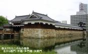 | 広島城 2014年6月18日 | 57城目 平和記念公園は訪れた事がありますが、広島城は初めての登城。 原爆により、国宝だった天守閣をはじめ城内の建造物は、 全て倒壊しました。 現在の天守は、昭和33年(1958)に外観を復元して再建された もので、白壁と木材の外観の対象が美しく、内部のコンクリート 造りを感じさせない見事な造りです。 復元された二の丸表御門から登城。 現地ガイドの方から、二の丸から本丸への土橋わきの被爆 ユーカリ、そして本丸・中御門跡では被爆後の猛火で赤く 変色した石垣、被爆マルヤナギの説明を受けました。 被爆樹木は、緑豊かに蘇生しており、そんな今の姿に強い 感銘を受けました。 護国神社前では、原爆投下時、動員学徒として通信業務に従事 していて奇跡的に助かった女学生が、福山・小倉へ「新型爆弾 により広島壊滅」の第一報を伝えた、中国軍管区司令部地下 通信室跡の説明も受けました。 広島城は、悲しい負の遺産の残る歴史の証人の城です。 しかし、今は被爆前の姿を取戻し、平和都市広島のシンボルに なっているのです。 |