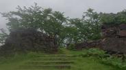 | 高取城 2009年8月25日 | 53城目。千早城より車で登城。国道169号から壷阪山駅少し手前の信号を斜めに一方通行を入っていくと地面の色がアスファルト色ではない色に変わる、この道は高取土佐街道というそうですが、この道沿いにスタンプの置いてある夢創館はありました。夢創館で資料をいただき説明を受け(なぜか資料のなかで地図だけは有料で¥10)、車で七つ井戸のそばまで移動し、虫よけスプレーをつけて山を登る。途中は草が生い茂っておりあまり人が通った形跡がない。結構登っていくと石垣が見え始め、上に着くと何人か観光客に出会った。多分別ルートで登ってきたものと思われる。城では¥10の地図がないと迷子になります。麓からの高低差は446mとのことでかなり高い山です。 |