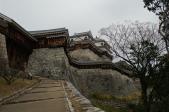 | 松山城 2014年12月8日 | 二の丸御殿を見学してから徒歩で山頂に登った。 急な坂の連続だったが、登山道が整備されているので苦にならなかった。 天守曲輪の櫓群が天守を引き立たせていて、実に美しい。 搦め手、乾櫓付近は、訪れるひともなく寂しい 乾門を出て本丸下の石垣添いを歩き、隠門続櫓下に抜ける。 よくも山頂にこんな高石垣を築いたと感心した。 |