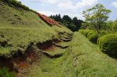 | 山中城 2016年4月30日 | 三島駅9時45分発山中行きに乗車、10時15分ごろ山中城跡に到着した。 西櫓を取り巻く障子堀、岱崎出丸の畝堀に感動した。 綺麗に整備されており、うす緑みどりの芝生とツツジの鮮やかな赤が綺麗だった。 ここで多くの人が戦いで命を落としたとは思えない、平和な公園という感じでした。 たぶん築城した当時は周囲の木々は伐採されて、見晴らしがよかったであろう。 また芝生もツツジも植栽されてなく、茶色の地面がむき出しで、歩きにくかったろう。 |