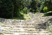 | 安土城 2009年6月7日 | 観音寺城のあとに行きました。 疲れが取れてほっとしたら着いて、この山を登るのかと思っていたら杖が置いてもらってありました。その杖を借りて、階段を上がりました。けっこう急な段もあり、杖が大いに役立ちました。 一時間かかりました。 |